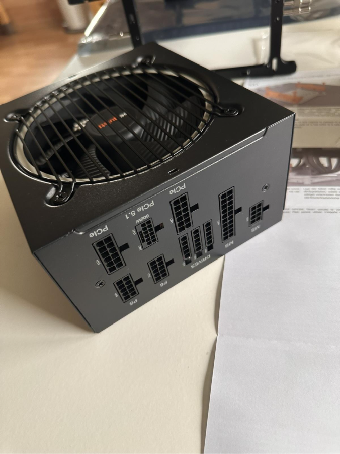 Die CPU sitzt auf einem ASUS TUF Gaming B650E-Plus Mainboard. Das “E” ist in diesem Fall wichtig, das bedeutet, vollen PCIe-5 Support. Gekühlt wird die CPU durch einen BeQuiet Dark Rock Pro 5. Ein massiver Luftkühler der die CPU zuverlässig kühl hält (Wir sind in 3DMark´s TimeSpy nicht über 79°C gekommen!) und dabei so Leise ist, dass es nicht beim Arbeiten stört. Zwei mal 16GB DDR5-6000 CL36 RAM von G.Skill machen das Paket komplett. Den Strom liefert ebenfalls BeQuiet mit seinem PurePower 12M 850W Netzteil mit 80+ Platinum Zertifizierung. Die volle Modularität kommt uns vor allem bei unserem offenen Konzept sehr gelegen.